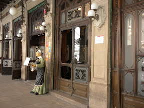 We quite easily (for us) found the central Plaza del Castillo and a convenient parking lot. We were overdue for a cafe leche and we circled the plaza looking for a promising spot. We found a very elegant restaurant, only to discover that it was Ernest Hemingway's favorite as well, Cafe Iruna. We read that there was a bust of Hemingway at his favorite spot at the bar and sure enough we found him just off the main part of the restaurant.